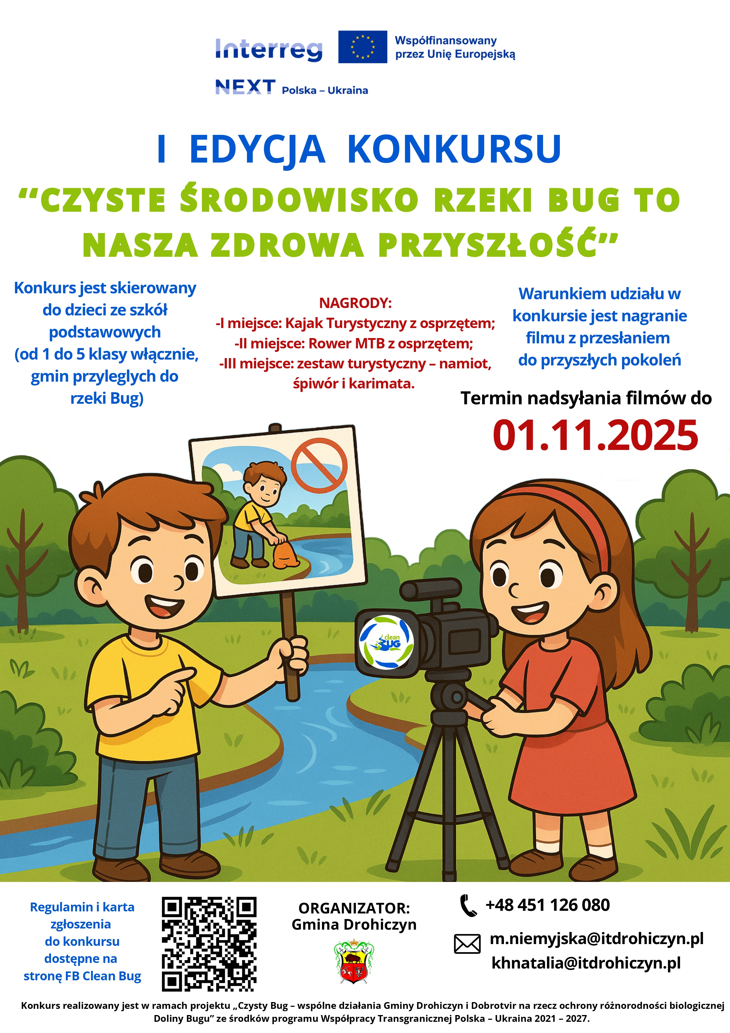 Zapraszamy uczniów klas 1–5 szkół podstawowych z gmin przyległych do rzeki Bug do udziału w I edycji konkursu filmowego, który organizujemy w ramach projektu „Czysty Bug – wspólne działania Gminy Drohiczyn i Dobrotvir na rzecz ochrony różnorodności biologicznej Doliny Bugu” ze środków programu Współpracy Transgranicznej Polska – Ukraina 2021 – 2027, nr PLUA.01.03-IP.01-0002/23”