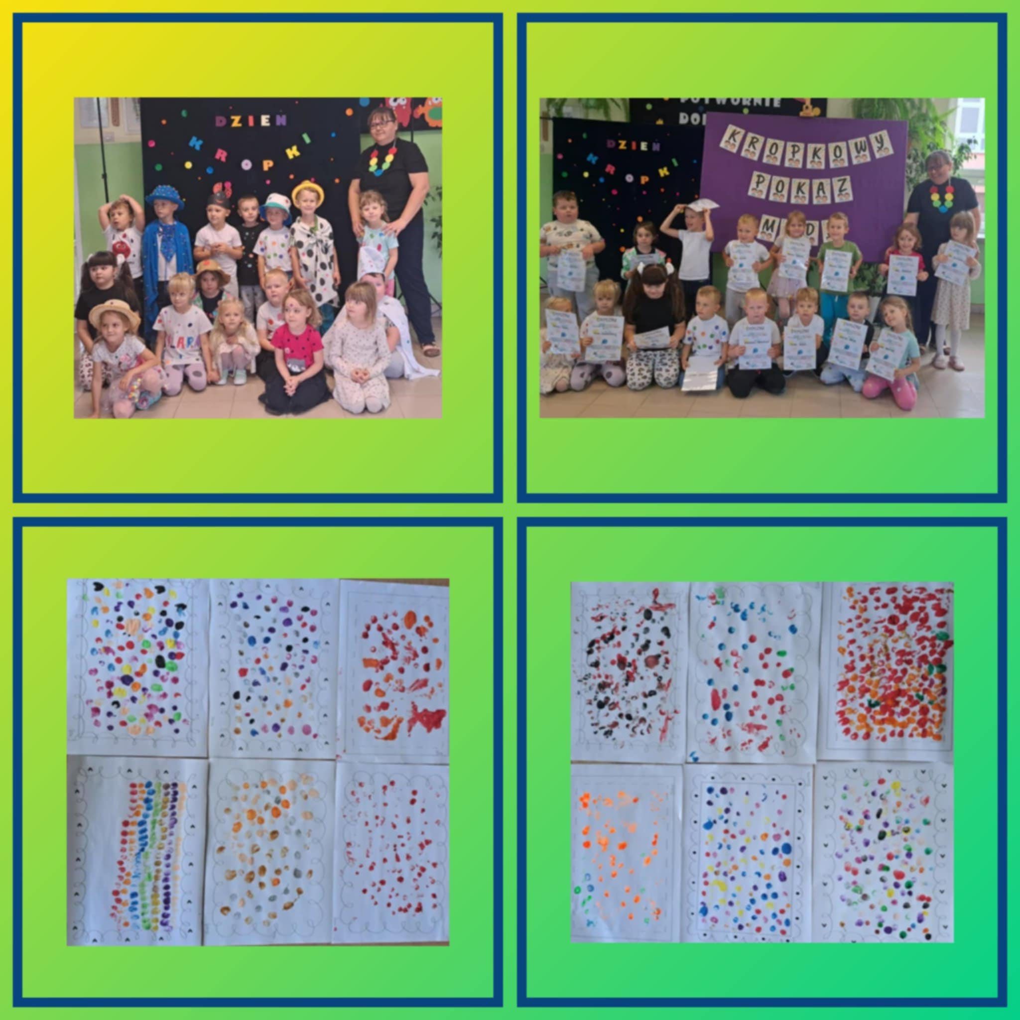 Dzień czwarty to aktywności ruchowe z kropką. W piątym dniu odbył się KROPKOWY POKAZ MODY do którego zaprosiliśmy inne grupy przedszkolne oraz uczniów klas 1-3.
