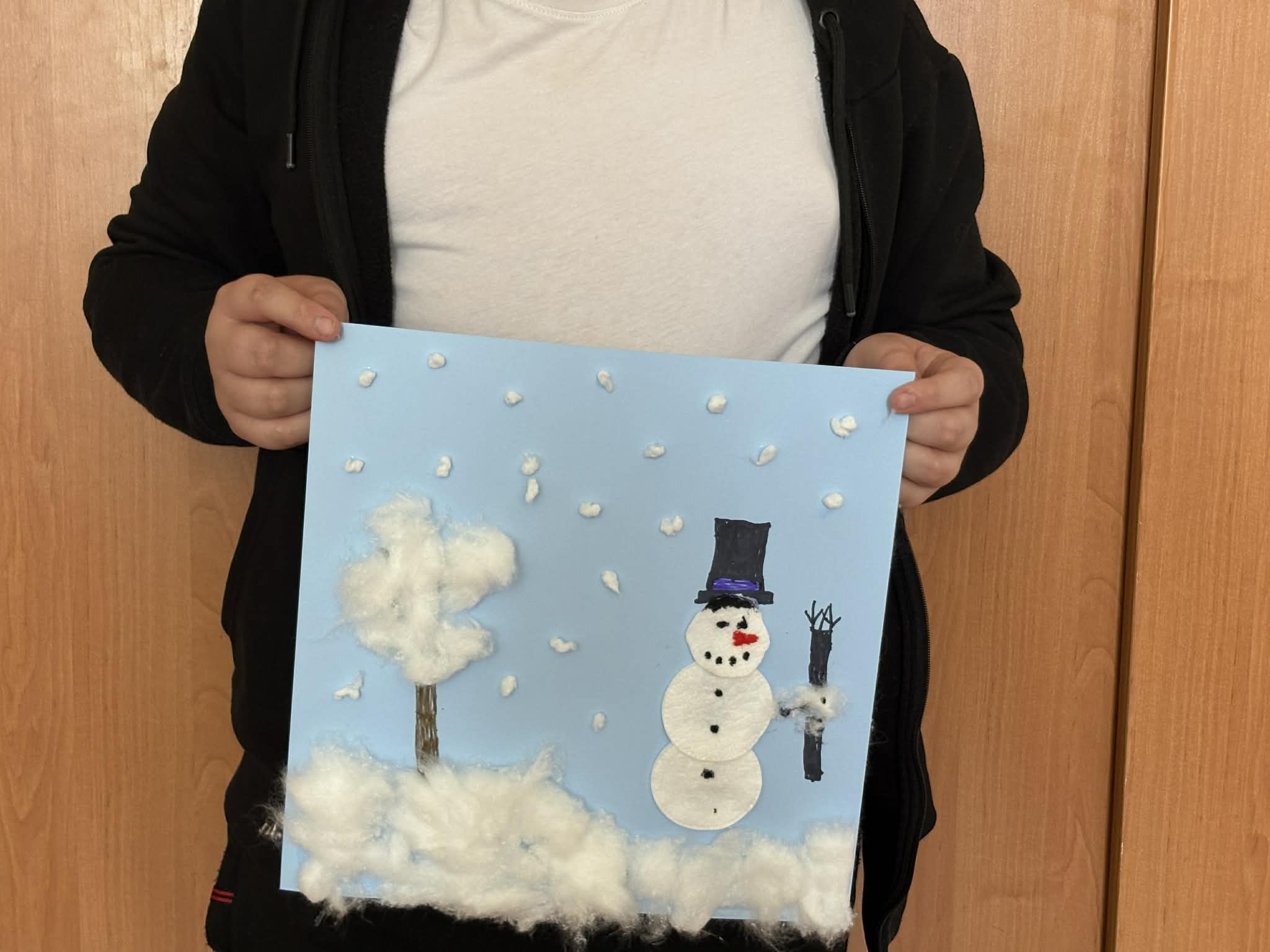 Podczas warsztatów powstała niezwykła praca przedstawiająca zimowy pejzaż. Wykorzystane zostały różnorodne materiały, m.in. płatki kosmetyczne, wata kosmetyczne, które pozwoliły stworzyć efekt śnieżnej, magicznej scenerii. ❄️